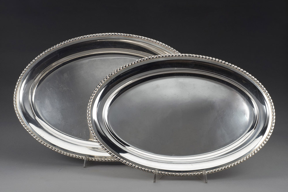 Due vassoi ovali in argento di misure diverse con bordo sagomato. Marchi del Fascio. S.A. Argenterie Loreto, Milano (cm 40x26,5; cm 44x30) (gr tot. 1400 ca) Two oval silver trays from Milan