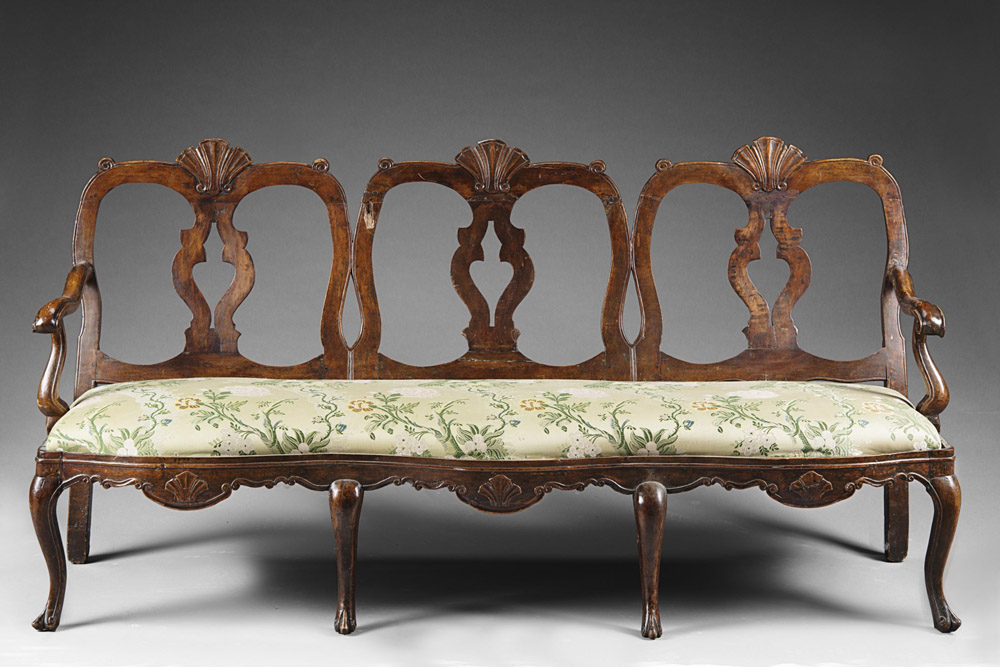 Divanetto a tre posti in noce con schienale a giorno intagliato a conchiglie stilizzate. Fascia sagomata e intagliata, braccioli e gambe mosse. Veneto, sec. XVIII (cm 175x90x55) (difetti e restauri) 18th-century three-seater walnut settee from Veneto (defects and restorations)