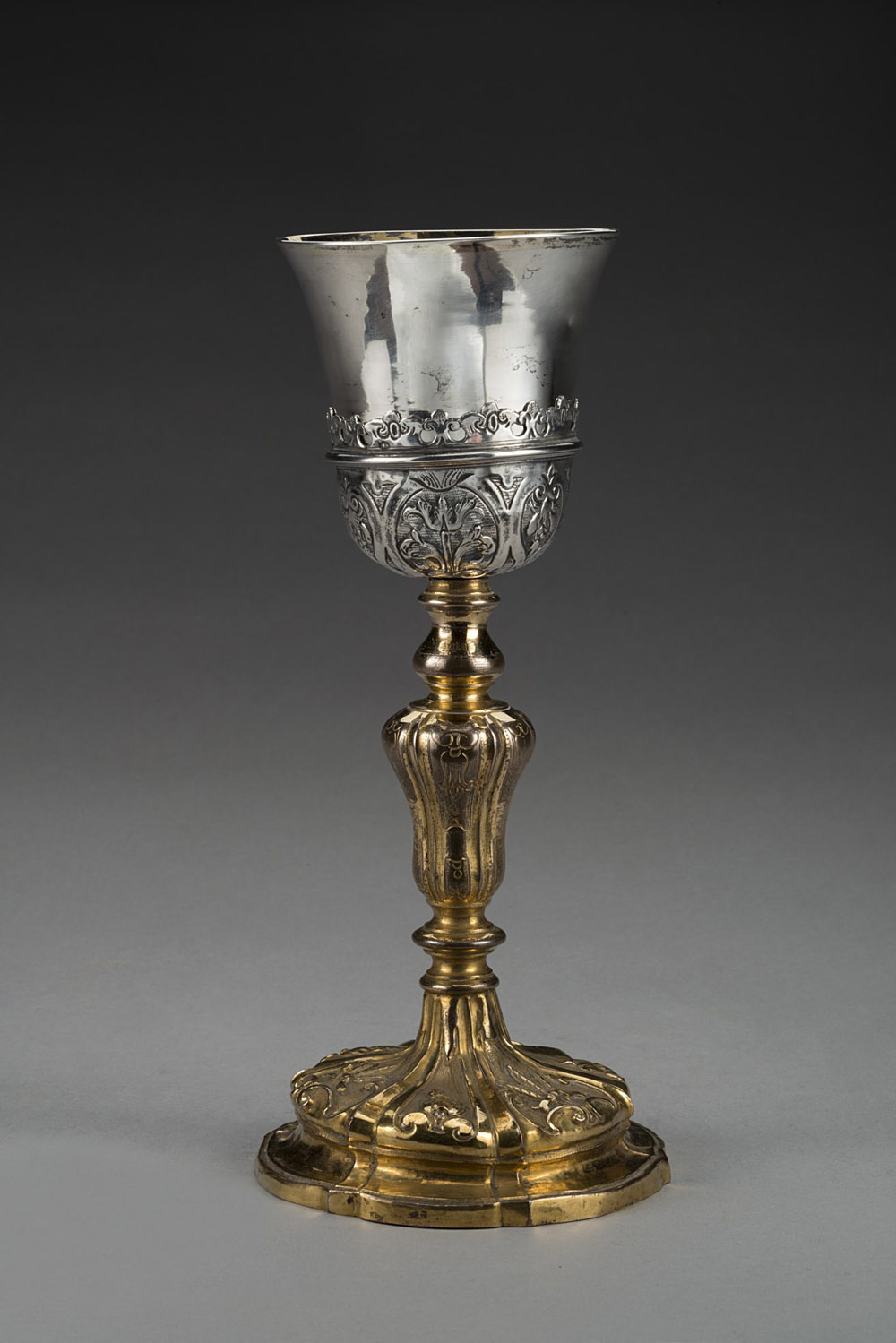 Calice in rame e argento dorati. Piede circolare mistilineo modanato e ripartito in sei specchiature decorate a motivi fitomorfi. Fusto a balaustro inciso e sottocoppa cesellati a motivi floreali entro riserve. Napoli, sec. XVIII/XIX (h. cm 25 ca) (difetti) 18th/19th-century gilt-copper and gilt-silver goblet from Naples (defects)