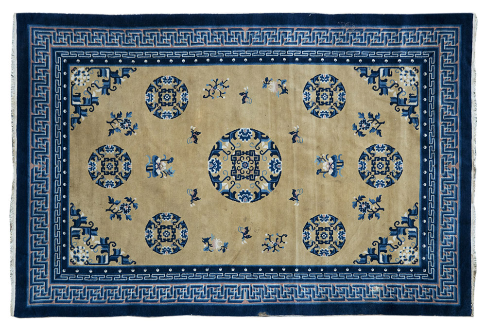 Tappeto Cina, sec. XX. Disegno a piccoli medaglioni beige su fondo blu (cm...