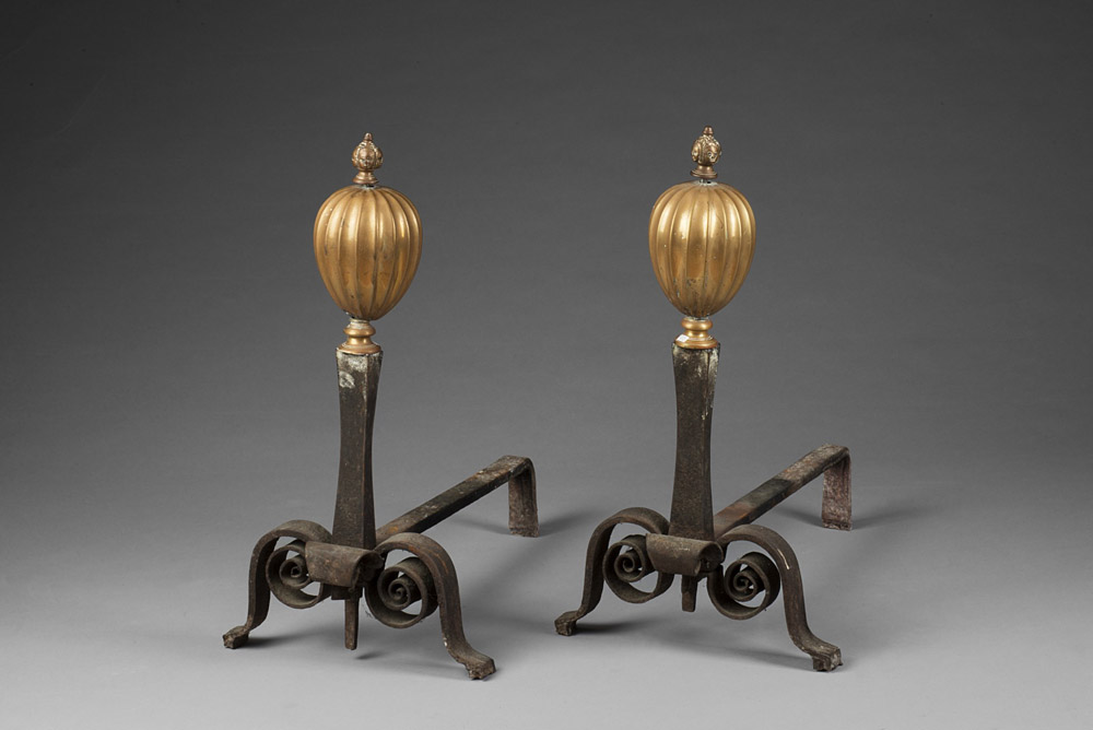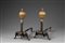 Coppia di alari in ferro battuto con puntali in bronzo scanalato, sormontati...