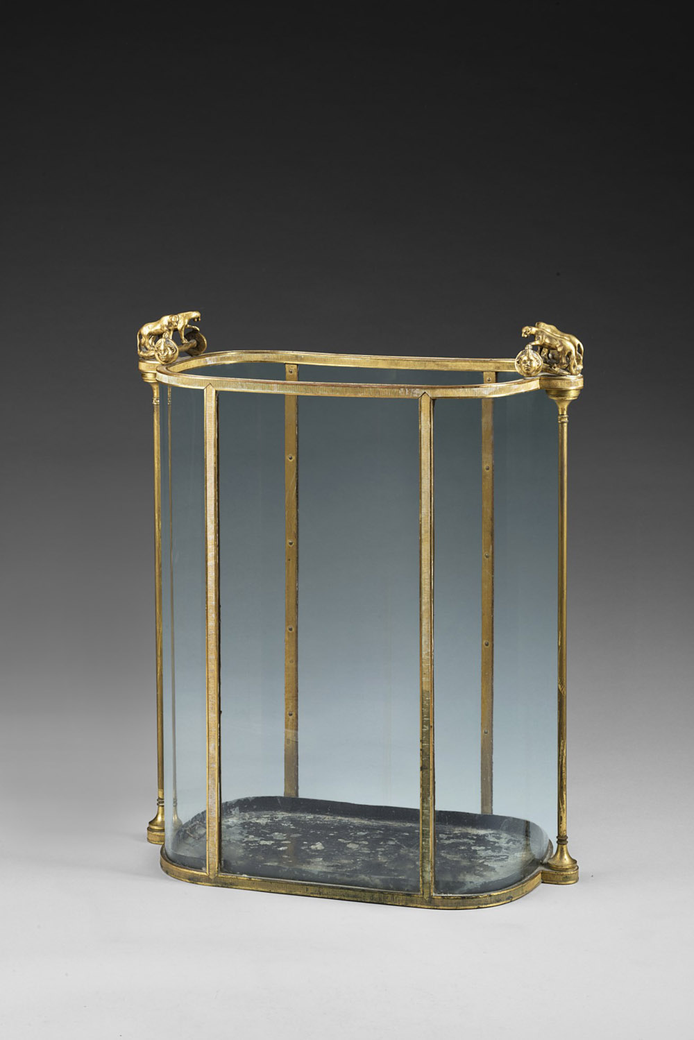 Portaombrelli in vetro con struttura in bronzo dorato e cesellato decorato con figure di animali e teste di Medusa. Sec. XIX (difetti) 19th-century glass umbrella stand (defects)