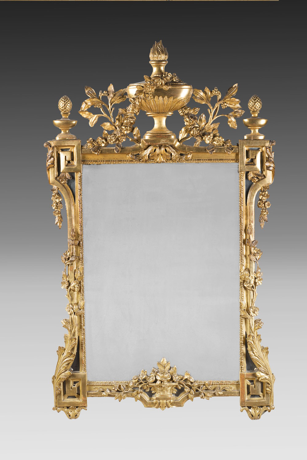 Specchiera con cornice in legno dorato con cimasa scolpita a vaso con fiamma, ghirlande floreali e foglie. Montanti con pinnacoli, pigne e rocaille e fascia inferiore scolpita a vaso fiorito. Francia, fine sec. XVIII (cm 97x160) (difetti e restauri) Late 18th-century French mirror with gilt-wood frame (defects and restorations)