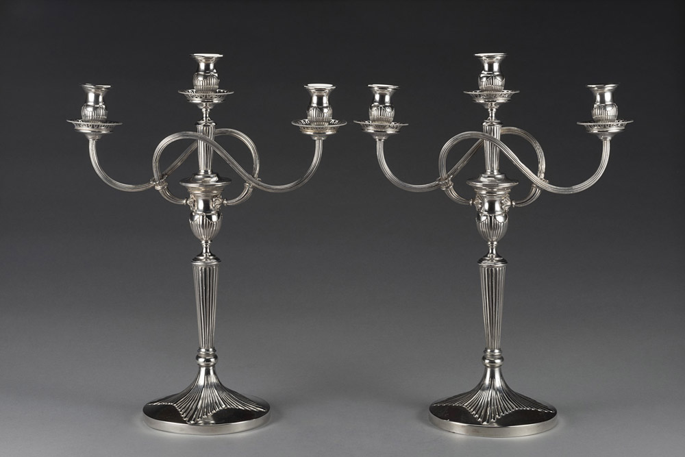 Coppia di candelabri a tre fiamme decorati a baccellature e scanalature...