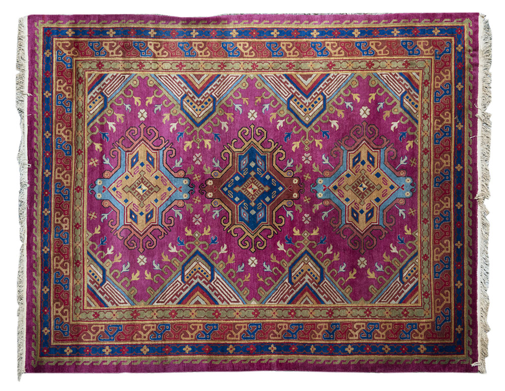Tappeto Samarkanda, Turkestan orientale, sec. XX. Disegno con tre medaglioni policromi su fondo ciclamino (cm 366x274) (difetti) 20th-century Samarkanda carpet from eastern Turkestan (defects)