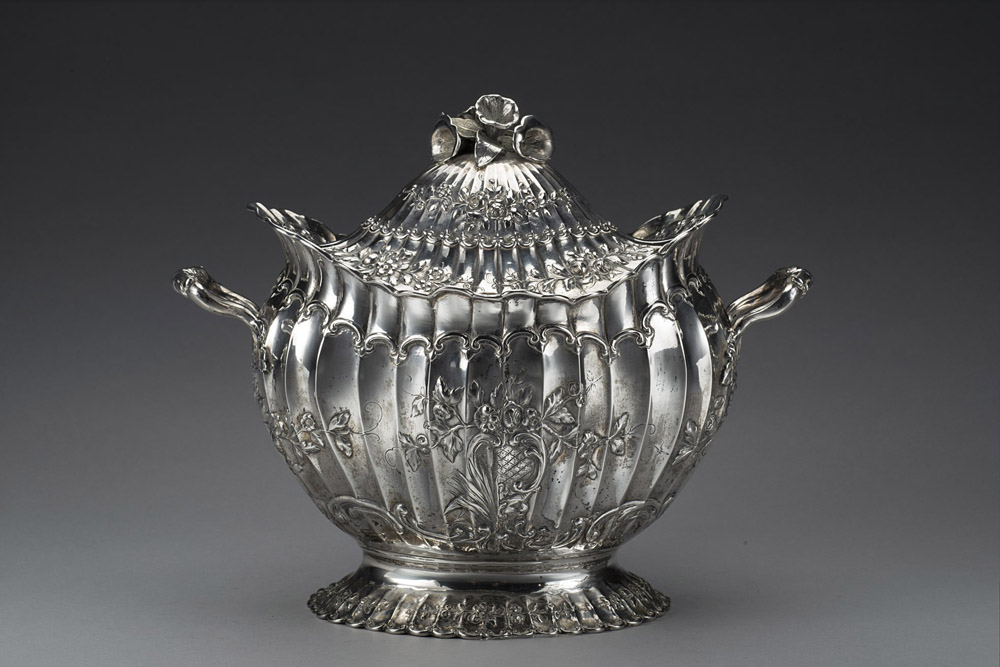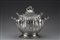 Zuppiera in argento a due manici con corpo ovoidale costolato, decorato con volute e motivi floreali. Presa del coperchio a campanule a tutto tondo, interno in vermeille. Germania, fine sec. XIX-inizio sec. XX (gr 1800 ca) (cm 27x31) (lievi difetti) Late 19th-century/early 20th-century silver tureen from Germany (minor defects)