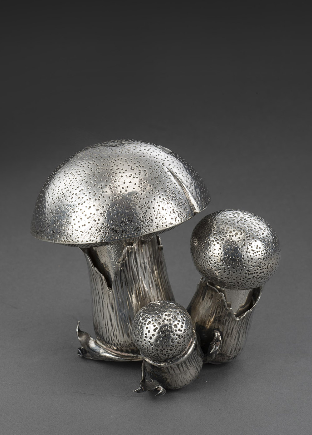 Servizio sale e pepe in argento raffigurante un gruppo di funghi. Milano anni...