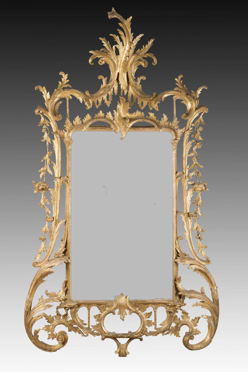 Antica specchiera di forma sagomata in legno riccamente intagliato, traforato e dorato a motivi vegetali, volute e fiori (cm 215x114) (difetti) Ancient wooden mirror (defects)