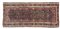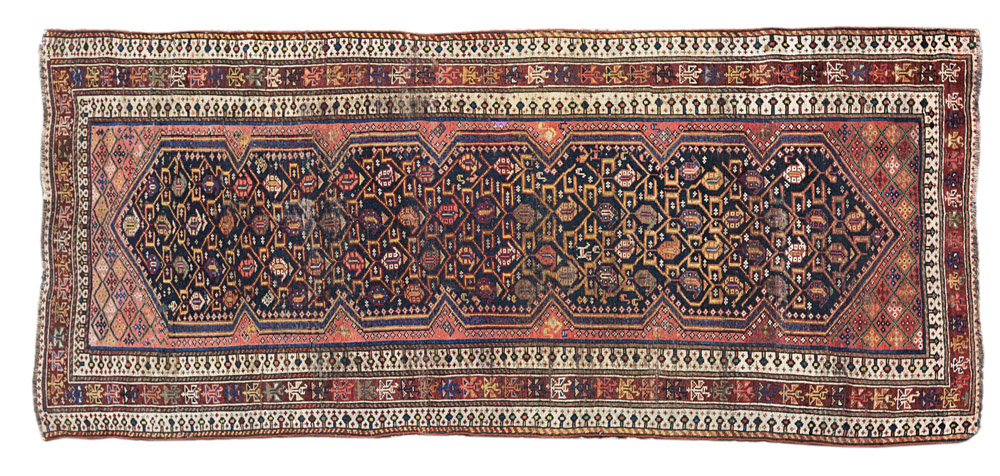 Tappeto Caucasico, inizio sec. XX. Campo blu decorato a motivi geometrici nei toni del giallo, rosa, avorio, verde e azzurro (cm 253x115) (difetti) Early 20th-century Caucasian carpet (defects)