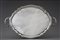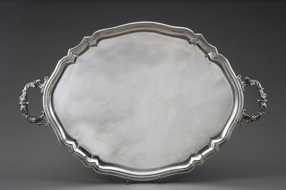 Grande vassoio biansato di forma sagomata con manici decorati a volute fogliate. Titolo 800 (cm 81x53) (gr 2800 ca) (lievi difetti) Large tray (minor defects)