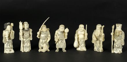 Sette statuette in avorio inciso, con vari personaggi, Cina, XX sec.