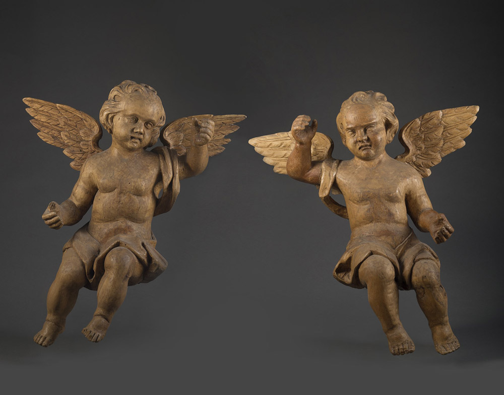 Coppia di sculture in legno raffiguranti putti alati. Sec. XVIII (h. cm 60)...