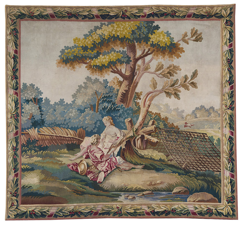 Arazzo raffigurante una scena bucolica in un paesaggio fluviale. Bordura decorata a motivi vegetali concatenati. Francia, sec. XIX (cm 195x200) 19th-century French tapestry