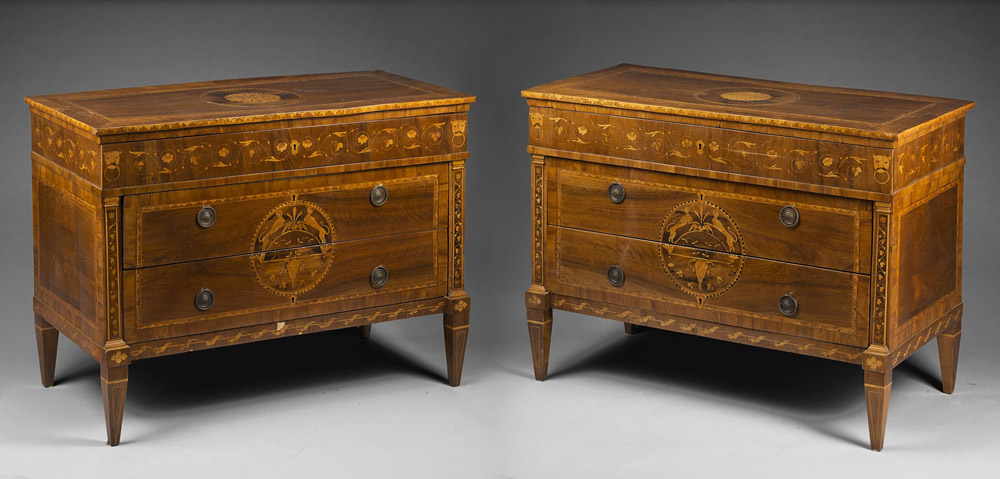 Coppia di comò lastronati in noce, piano filettato in in legno chiaro, intarsiato al centro da medaglione con volute fogliate. Fronte a tre cassetti decorati a motivi concatenati, teste leonine e rosone con animali fantastici e teste di ariete. Fianchi riquadrati, gambe rastremate. Seconda metà del sec. XVIII (cm 122x90x57) (difetti e restauri) Pair of walnut-veneered drawer chests. Second half of the 18th century (defects and restorations)