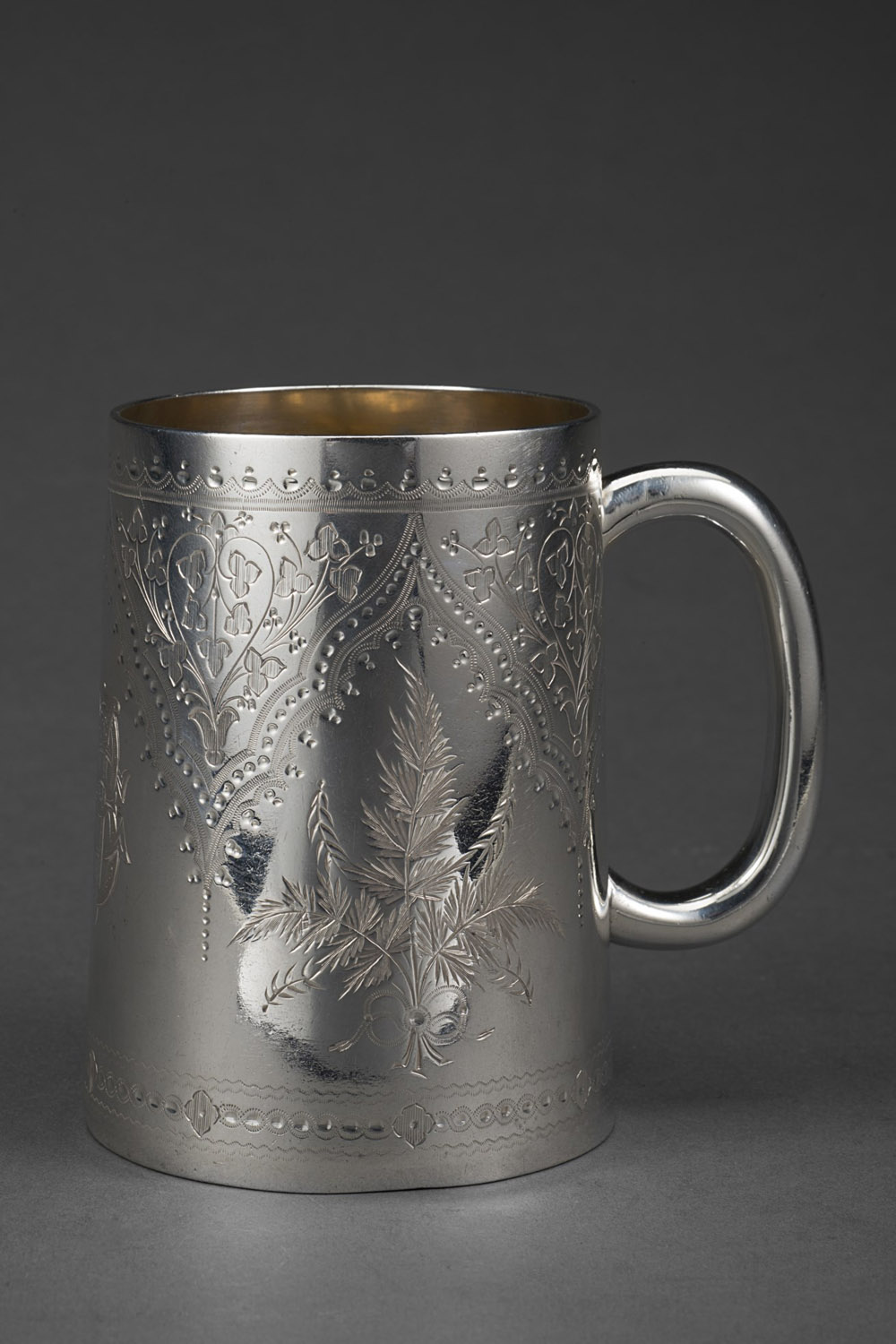 Boccale in argento di forma cilindrica cesellato con motivi di rampanti e felci entro riserve all'orientale. Londra, 1874 (h. cm 9,5) (gr 180 ca) (lievi difetti) Silver mug. London, 1874 (minor defects)