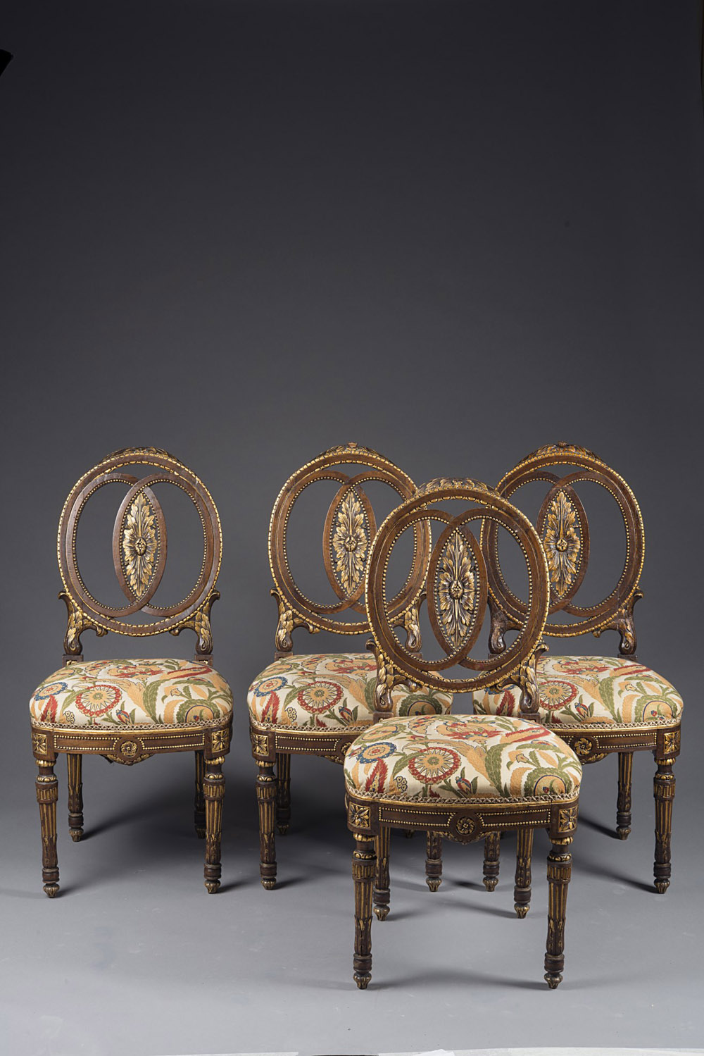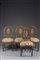 Gruppo di quattro sedie con schienale a giorno in legno intagliato a fregi fogliati e parzialmente dorato. Gambe scanalate, decorate all'attacco da rosoni. Sec. XVIII (doratura di epoca posteriore) (lievi difetti) Group of four 18th-century carved-wood chairs (minor defects)