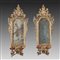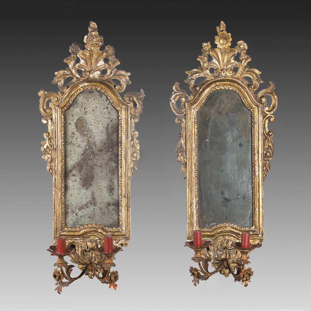Coppia di ventole a due fiamme in legno intagliato e dorato con cimasa traforata e scolpita a fiori e volute, portacandele in ferro laccato. Sec. XVIII (cm 70x30) (difetti) Pair of 18th-century wooden mirror (defects)