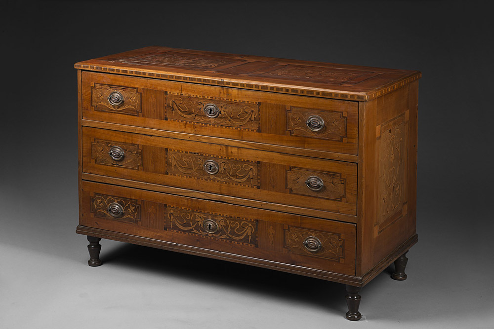 Comó in noce e radica con coperchio e fianchi intarsiati e filettati in legni vari a volute fogliate, vasi fioriti e animali fantastici. Fronte a tre cassetti, decorato a mascheroni e volute. Piedi torniti. Veneto, sec. XVIII (cm 128x85x58) (difetti e restauri) 18th-century walnut and briar-root drawer chest from Veneto (defects and restorations)