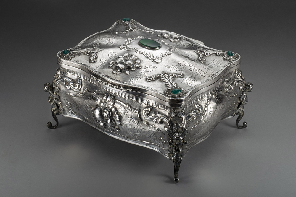 Cofanetto portagioie in argento e pietre dure sbalzato e cesellato a motivi...