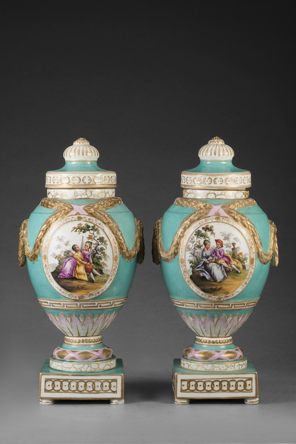 Manifattura di KPM, Berlino sec. XIX. Coppia di vasi con coperchi in porcellana a fondo azzurro decorati in rilievo a festoni dorati e a scene galanti in policromia entro riserve ovali. Basi squadrate a motivo concatenato (h. cm 25) (restauri) Pair of 19th-century porcelain vases. Berlin (restorations)