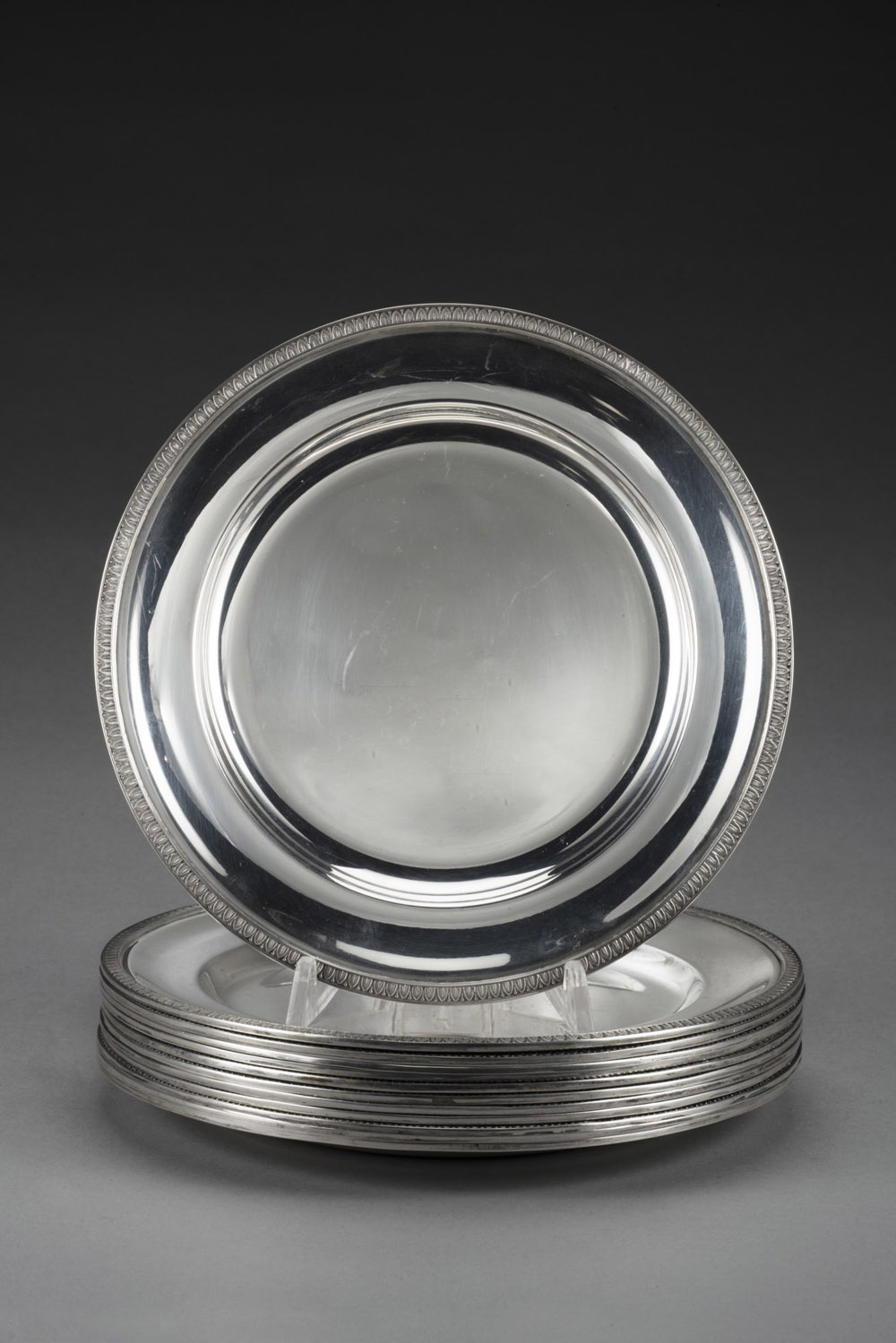 Dodici piatti lisci in argento con bordura a palmette. Milano, anni '60 (d....