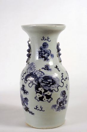 Vaso in porcellana bianca e blu, con decorazioni raffiguranti cani di Pho, Cina, seconda metà XIX sec., cm. h. 45.