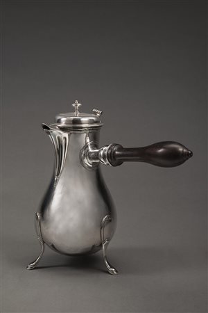 Cioccolatiera in argento a corpo liscio con beccuccio scanalato, piedini mossi decorati a volute all'attacco, manico in legno tornito. Parigi, 1783 (h. cm 22) (gr lordi 540) (difetti) Silver chocolate jug. Paris, 1783