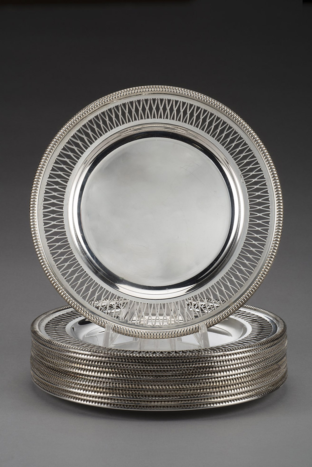 Dodici piatti in argento di forma circolare con bordura godronata, tesa traforata a raggi intrecciati; fondo liscio. Italia, anni '60 (d. cm 20) (gr 2190 ca) Twelve silver plates. Italy, 1960s