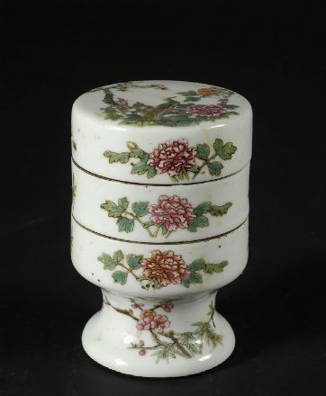Vaso circolare a tre scomparti in porcellana bianca con decori floreali, Cina...