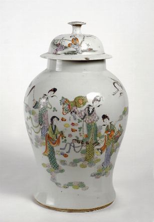 Giara a tempio in porcellana, in stile famille rose, con decorazioni raffiguranti divinità femminili, Cina, fine XIX-inizi XX sec., cm. h. 45. (rotture sul coperchio).