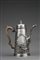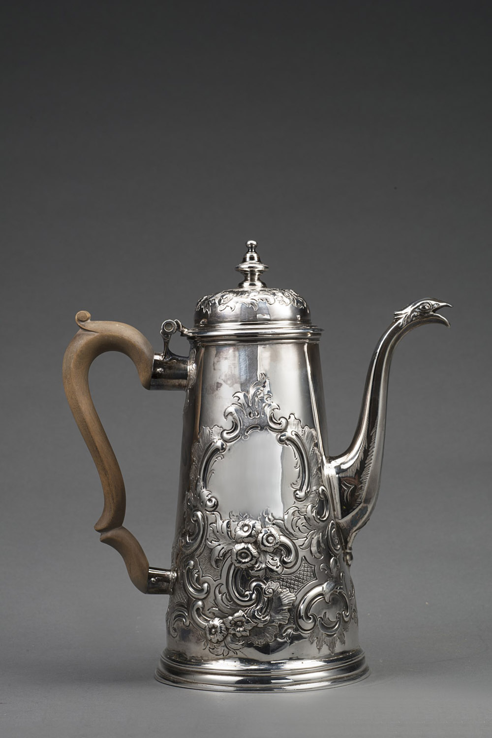 Caffettiera in argento a corpo troncoconico sbalzato a fiori e volute. Coperchio bombato, versatoio con beccuccio zoomorfo e manico a doppia ansa. Londra, 1734. Argentiere Humph Payne (h. cm 25) (gr 750 ca) (difetti) Silver coffee pot. London, 1734 (defects)