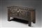 Antica cassapanca in legno scolpito a cavalieri a cavallo con drago. Montanti...