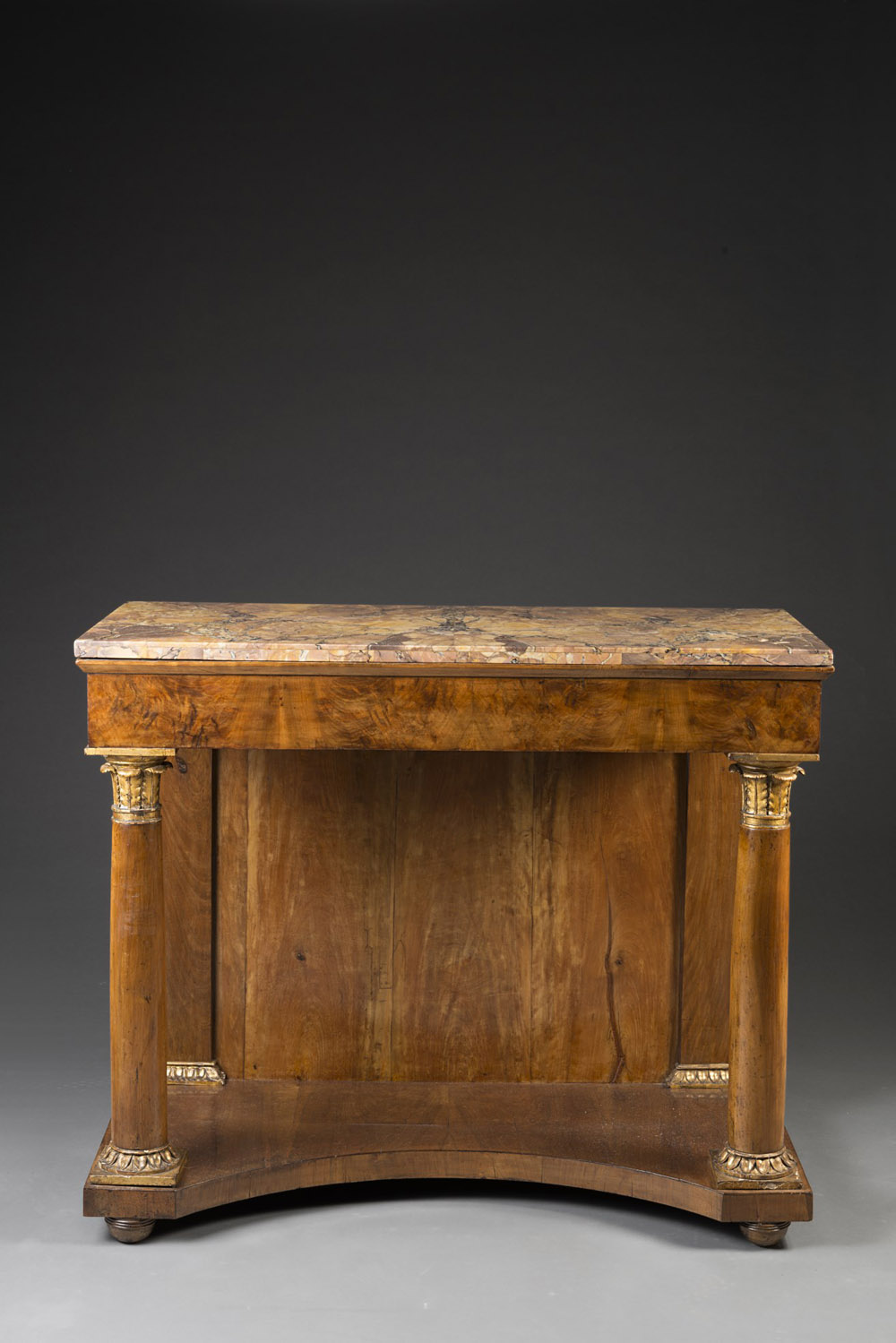 Consolle lastronata in noce con montanti a colonna tornita terminanti a capitelli intagliati e dorati poggianti su mensola sagomata. Piano lastronato in marmo (cm 122x103x60) (difetti) Walnut-veneered console table with marble-veneered top (defects)