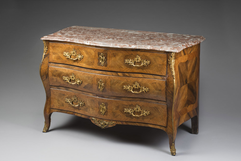 Commode di forma bombata a tre cassetti con fronte e fianchi lastronati, filettati e riquadrati in legni vari. Montanti, piedi e cassetti decorati con fregi in bronzo dorato, piano in marmo. Francia, sec. XIX (cm 122x82x63) (lievi difetti) 19th-century French drawer chest (minor defects)