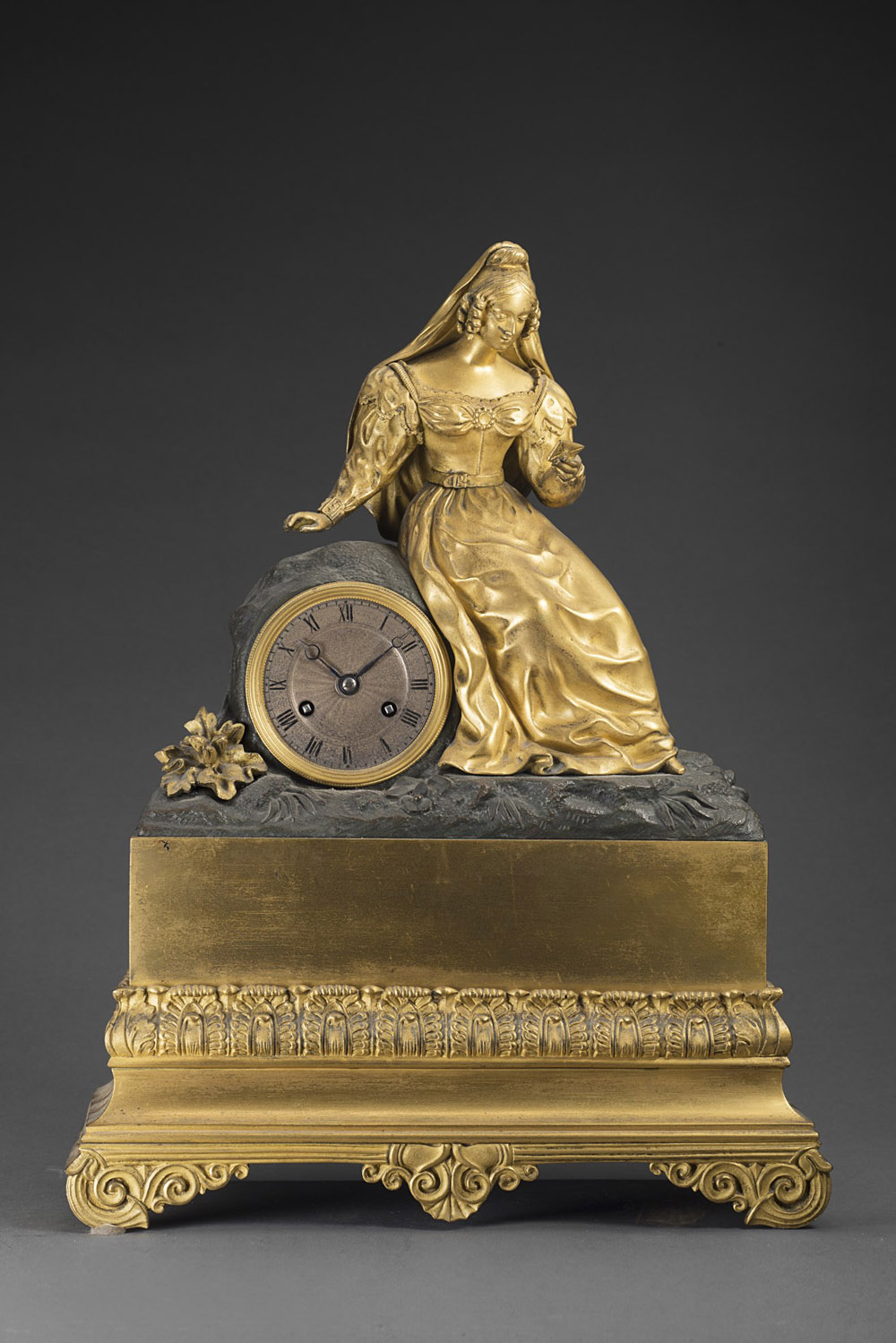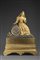 Orologio da camino in bronzo dorato ossidato con cassa decorata con figura...