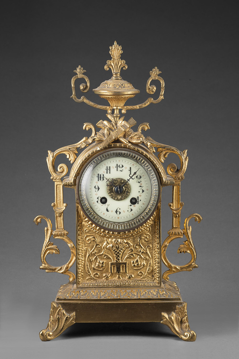 Orologio da camino in ottone dorato con cassa decorata con da anse a volute e...