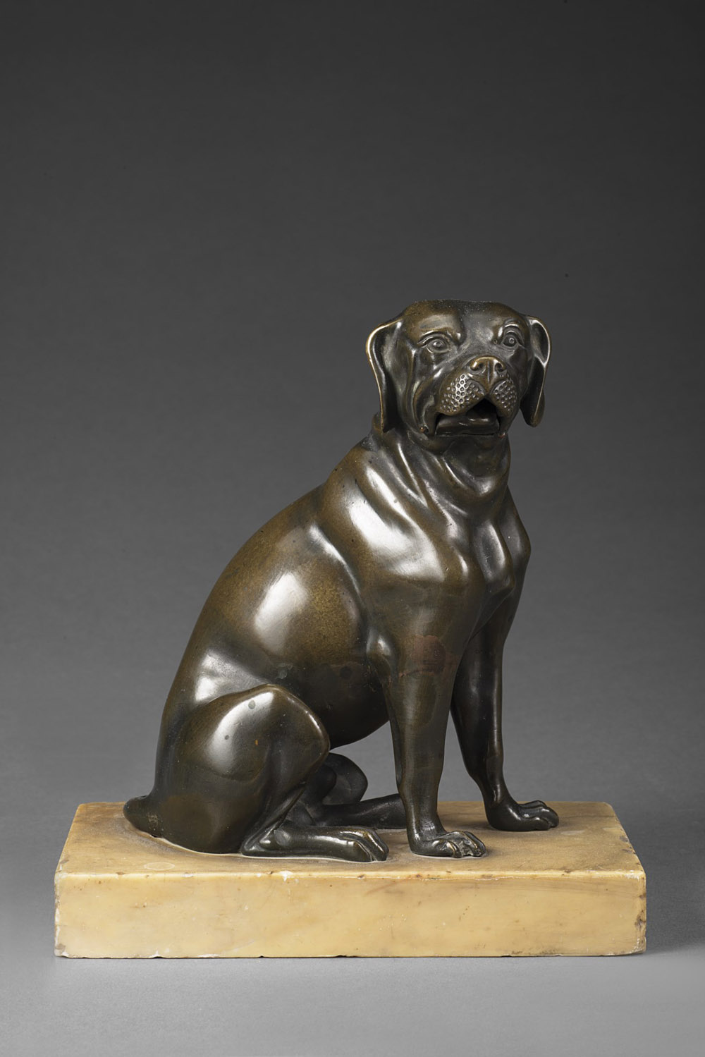 Scultore del sec. XIX "Mastino" scultura in bronzo (h. cm 15) poggiante su base in marmo (difetti) 19th-century sculptor "Mastiff" bronze sculpture (defects)