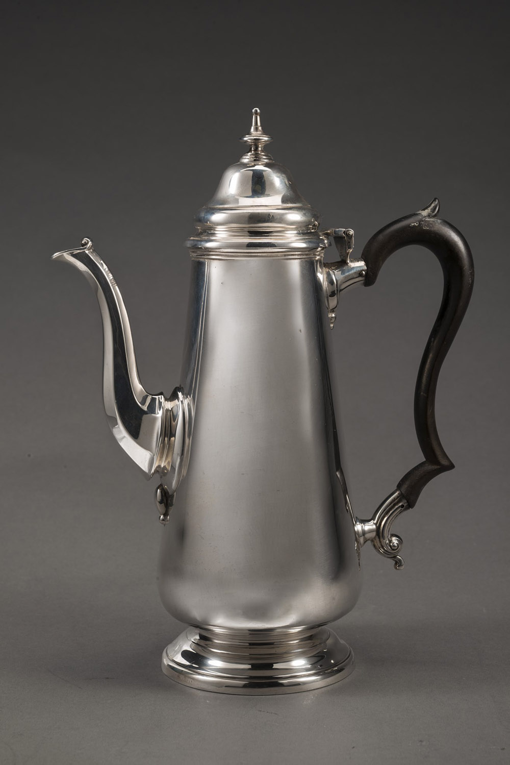 Caffettiera in argento a corpo liscio, presa del coperchio a trottola, ansa...