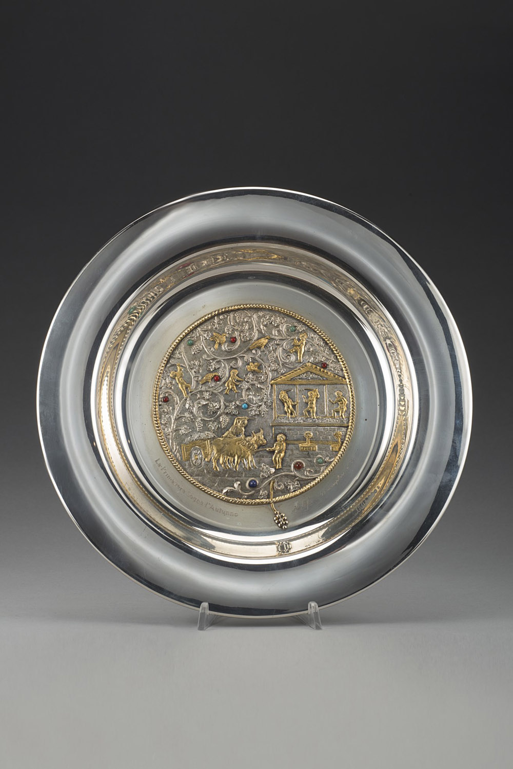 Lot 615 | Piatto artistico in argento parzialmente dorato con pietre dure e smalti con...