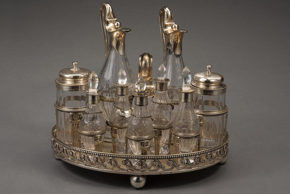 Cruet in argento con base sagomata, bordo traforato con motivo ad onde, portabottiglie con bordi perlinati e montanti scanalati (largh. cm 24) (gr 1180) (bottiglie di epoche diverse, difetti) Silver cruet (bottles of different periods, defects)