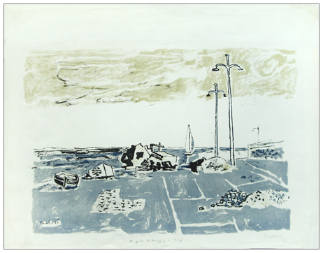 ORFEO TAMBURI Jesi 1910 – Parigi (Francia) 1994 Il porto di Anzio 1956 Litografia a 3 colori es.p.a. Firma e data in b. a d., titolo e data in b. al c. (42,3 x 53 foglio – 32,5 x 46 ca. lito.) Autentica galleria Sant’Agostino, Modena su foto. Pubbl.: “Orfeo Tamburi Litografie” cat. Graphis Arte, Livorno, pp.34, 215. B.A.: 100