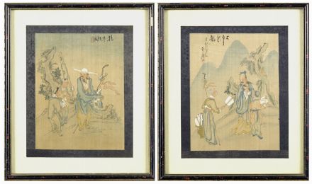 Coppia dipinti su seta, raffiguranti scene tratte da racconti tradizionali cinesi, Cina, fine XIX-inizi XX sec., cm. 23x18 ciascuno.