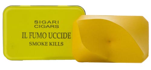 Giuseppe Amadio Todi (Pg) 1944 Smoke Kills , Tela estroflessa, cm. 9,5x14 posta all'interno di cofanetto porta sigari. L'Opera prende l'idea dagli avvertimenti scritti su ogni confezione di sigarette e sigari per la nocività del suo contenuto. Egli pone all'interno dei cofanetti un suo originale estroflesso per ricordare che l'arte è creatività e vita al contrario del fumo che uccide., Sul verso: scritto di Autenticità dell'Artista con timbro, firma e descrizione. Certificato di Autenticità dell'Artista.