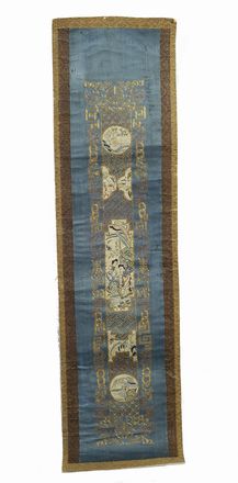Scroll verticale in seta, ricamato con figure e simboli tradizionali, Cina, fine XIX-inizi XX sec., cm. 68x17.