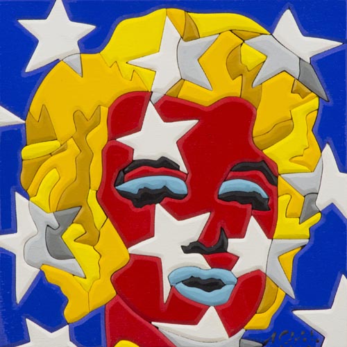 Ugo Nespolo Mosso Santa Maria (Bi) 1941 Stars , Acrilici su legno inciso, cm. 20x20, Firmato i basso a destra; Sul verso: firma, timbro a fuoco dell'Artista,descrizione ed etichetta "Autenticity Nespolo con n° 3200531255. Autentica dell'Artista su foto, con n° 3200531255.