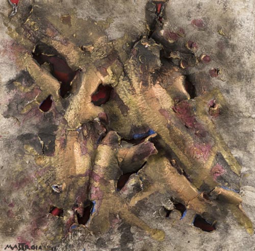 Umberto Mastroianni Fontana Liri (Fr) 1910 Marino Laziale (Rm) 1998 Composizione anni '70, Tecnica mista e strappi su cartone sagomato, cm. 59x59x3 applicato su tavola con tela grezza, Firmato in basso a sinistra. Sul verso: "Etichetta Galleria Bonino", Buenos Aires, con descrizione. Certificato di Autenticità e provenienza "Farsetti Arte", Prato.