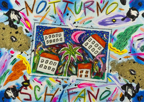 Bruno Donzelli Napoli 1941 Notturno Schifano , Olio e tecnica mista su tela, cm. 50x70, Firmato in basso a destra; Sul verso: firma e titolo. Autentica dell'Artista su foto.