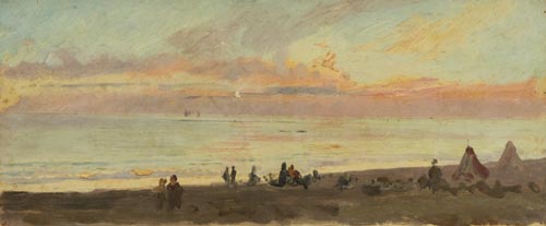 Sassi Pietro (Attribuito) Appena dopo celato il sole - Spiaggia di Levanto 1880, Olio su carta, cm. 14x32 Sul verso: titolo e data.