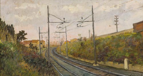 Gio Batta Lepori Livorno 1911 Livorno 2002 Il fischio 1950, Olio su tavola, cm. 34,5x63,5 Firmato in basso a destra; Sul verso: titolo, data ed Etichetta dell'Artista con descrizione.