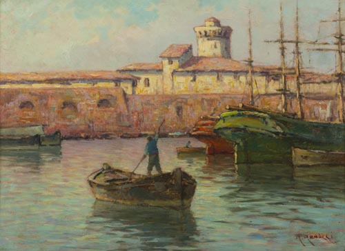 Renuccio Renucci Livorno 1880 Livorno 1947 Vecchio porto , Olio su tavola, cm. 43x59 Firmato in basso destra.